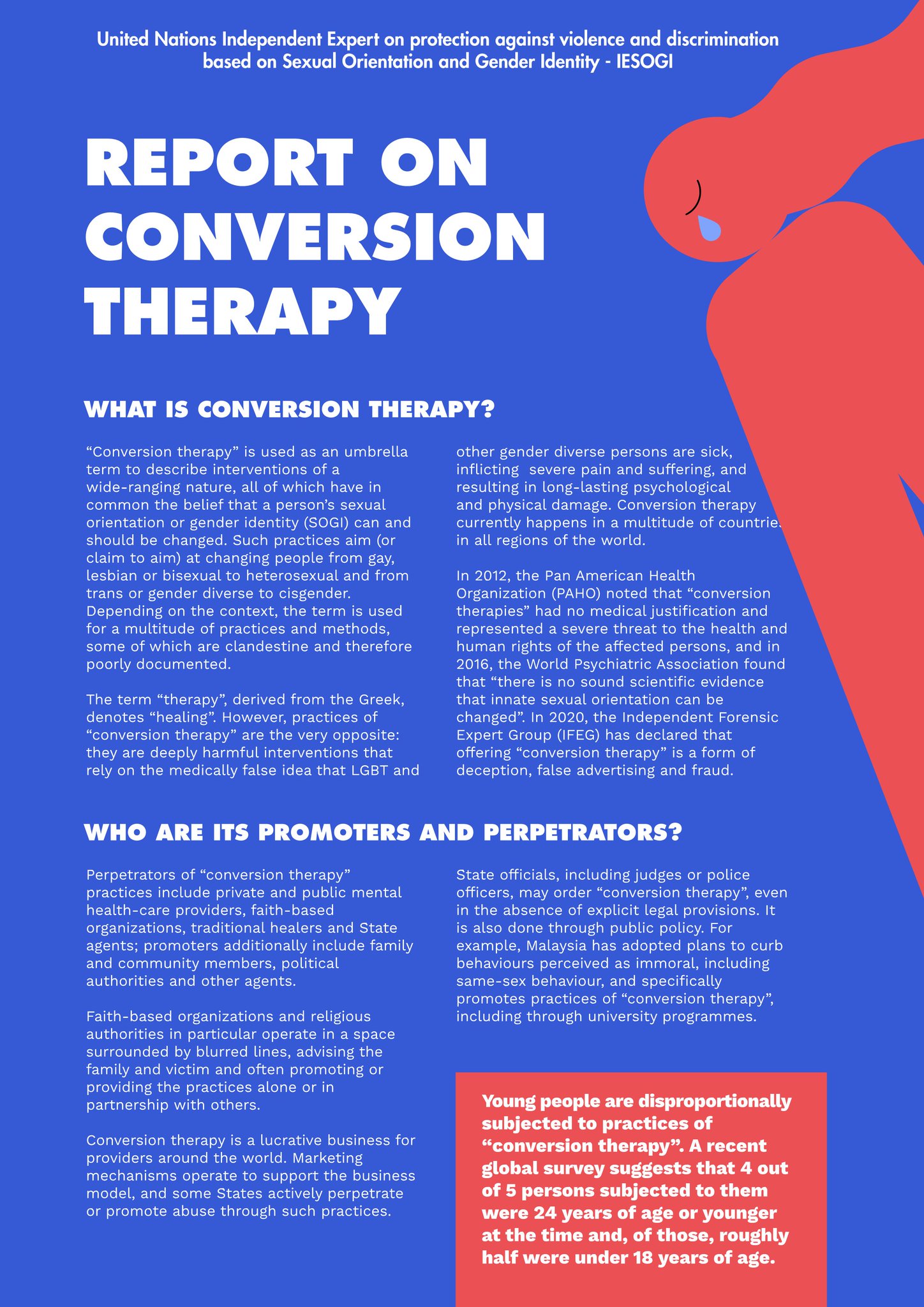 Conversion therapy refers to any of several dangerous and discredited practices aimed at changing an individual's sexual orientation or gender identity.